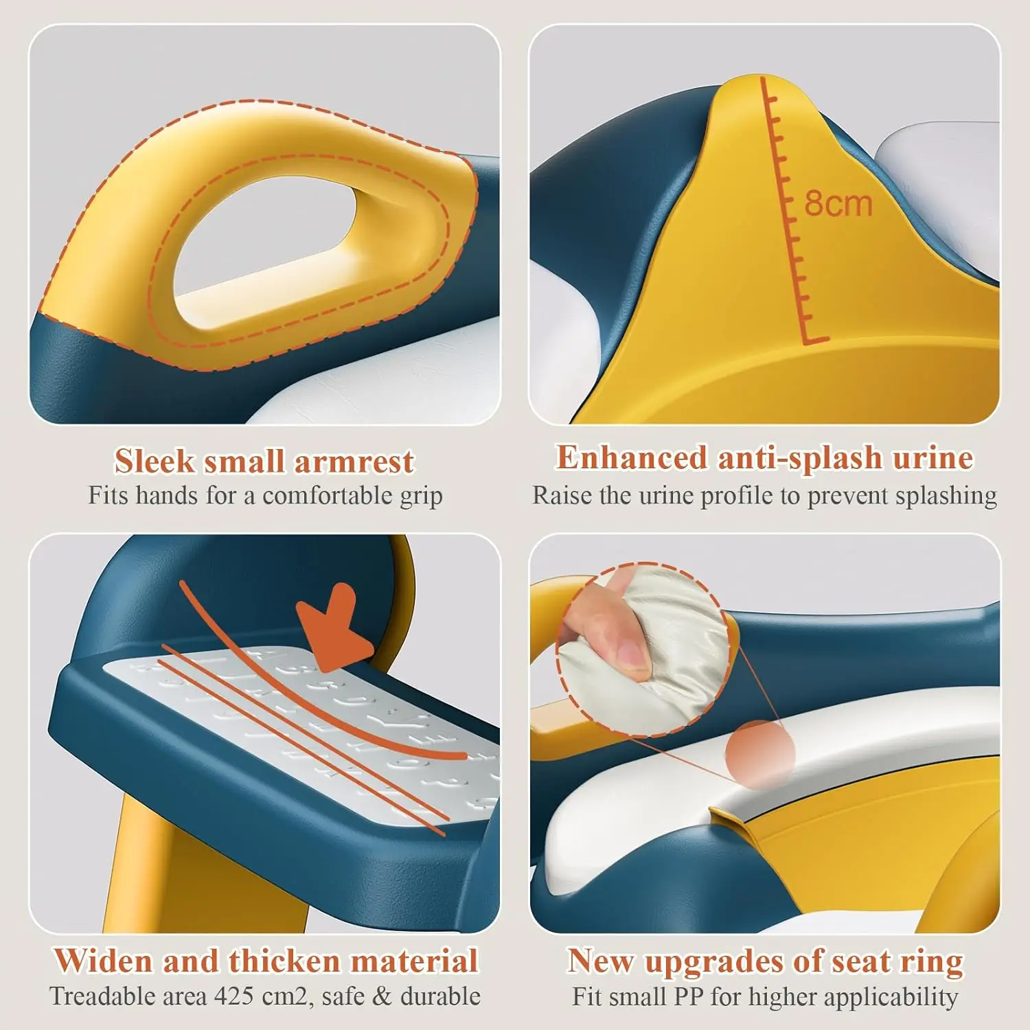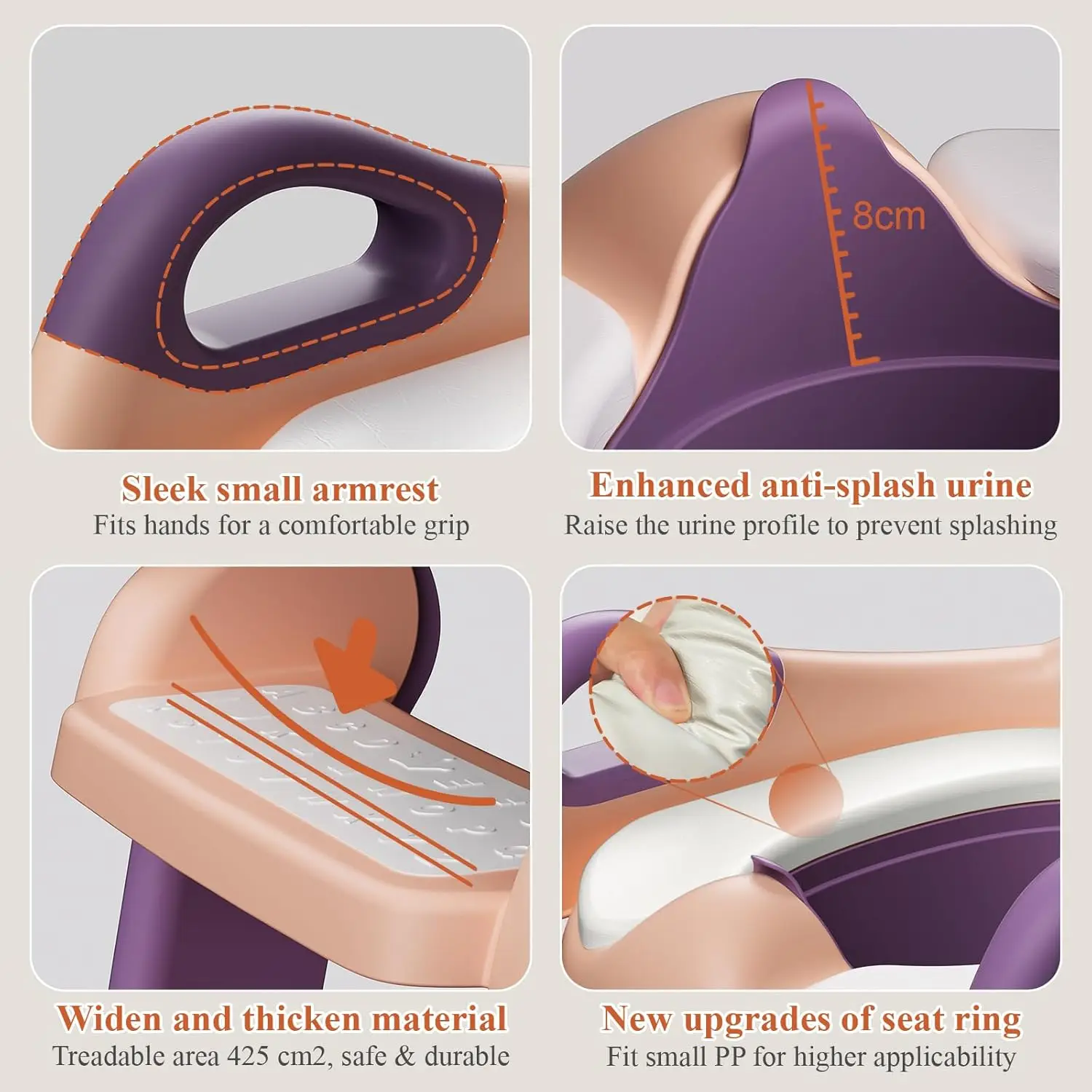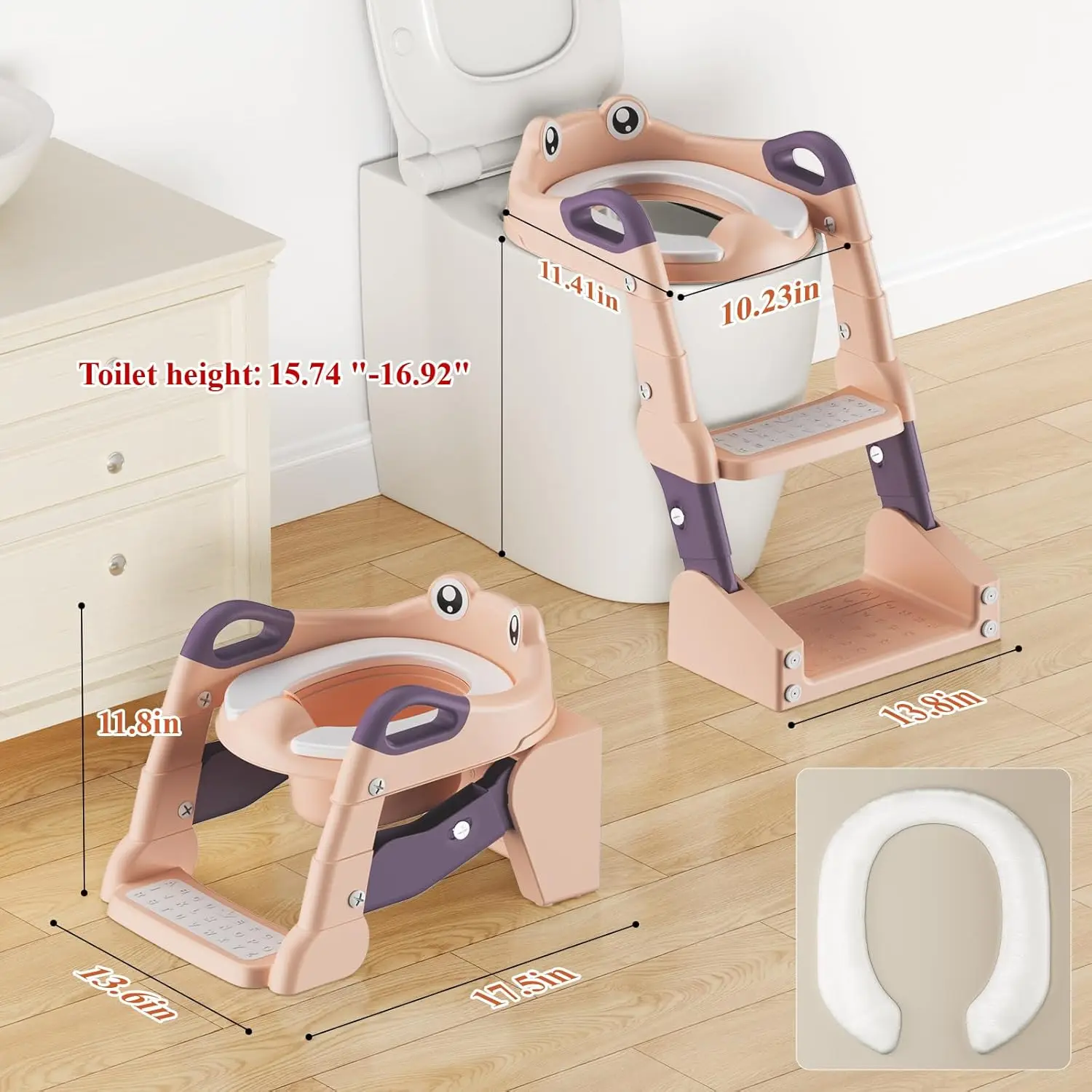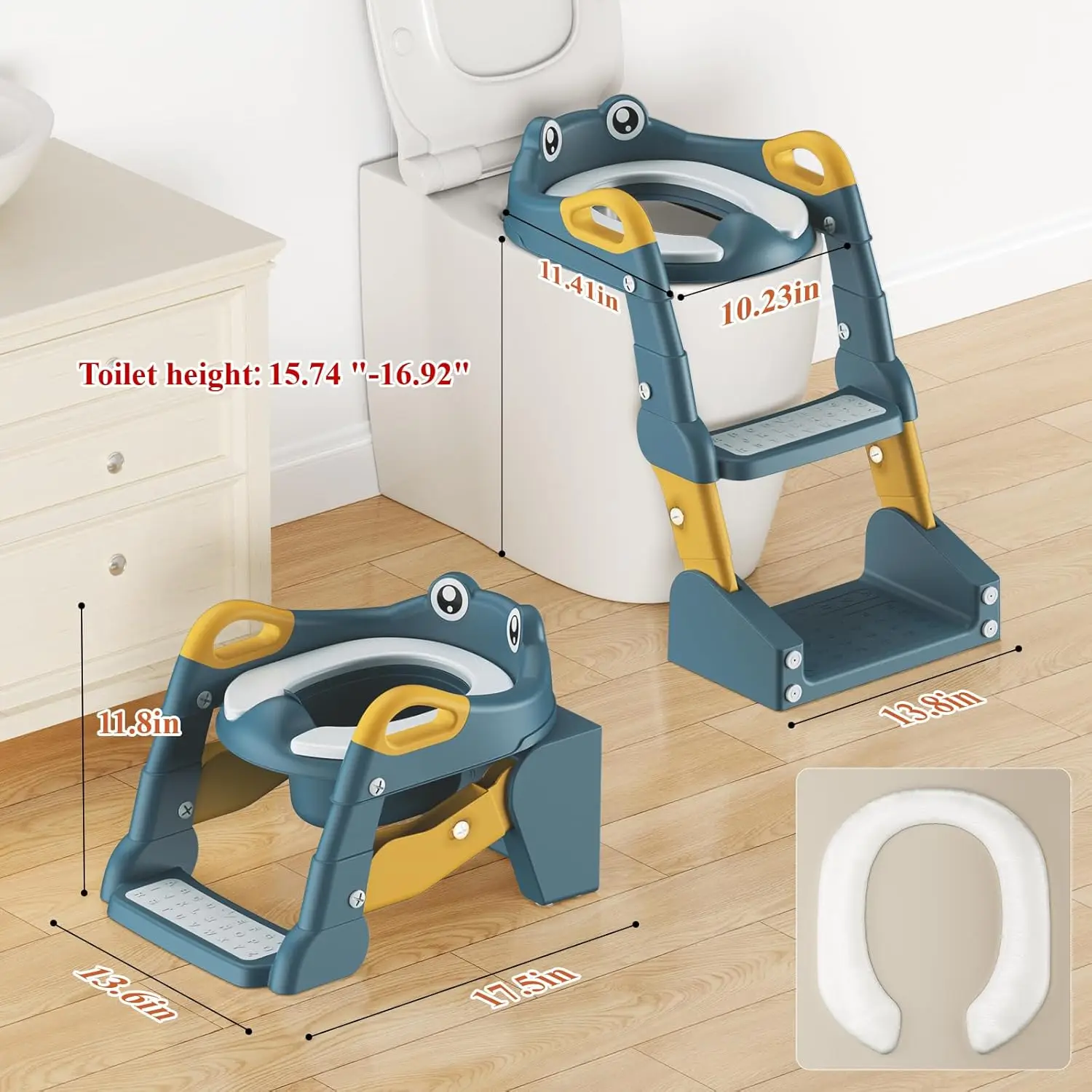 - 【UPGRADED DUAL-FUNCTION】 Our upgraded toilet seat offers numerous advantages: ①- Functions as a potty seat or toilet ladder, enhancing toddlers’ toilet training skills. ②- Splash-proof urine design. ③- Soft and removable cushion design. ④- Foldable design. ⑤- Easy transformation for convenient use. THE BEST 2-IN-1 CONVERTIBLE TOILET POTTY TRAINING SEAT