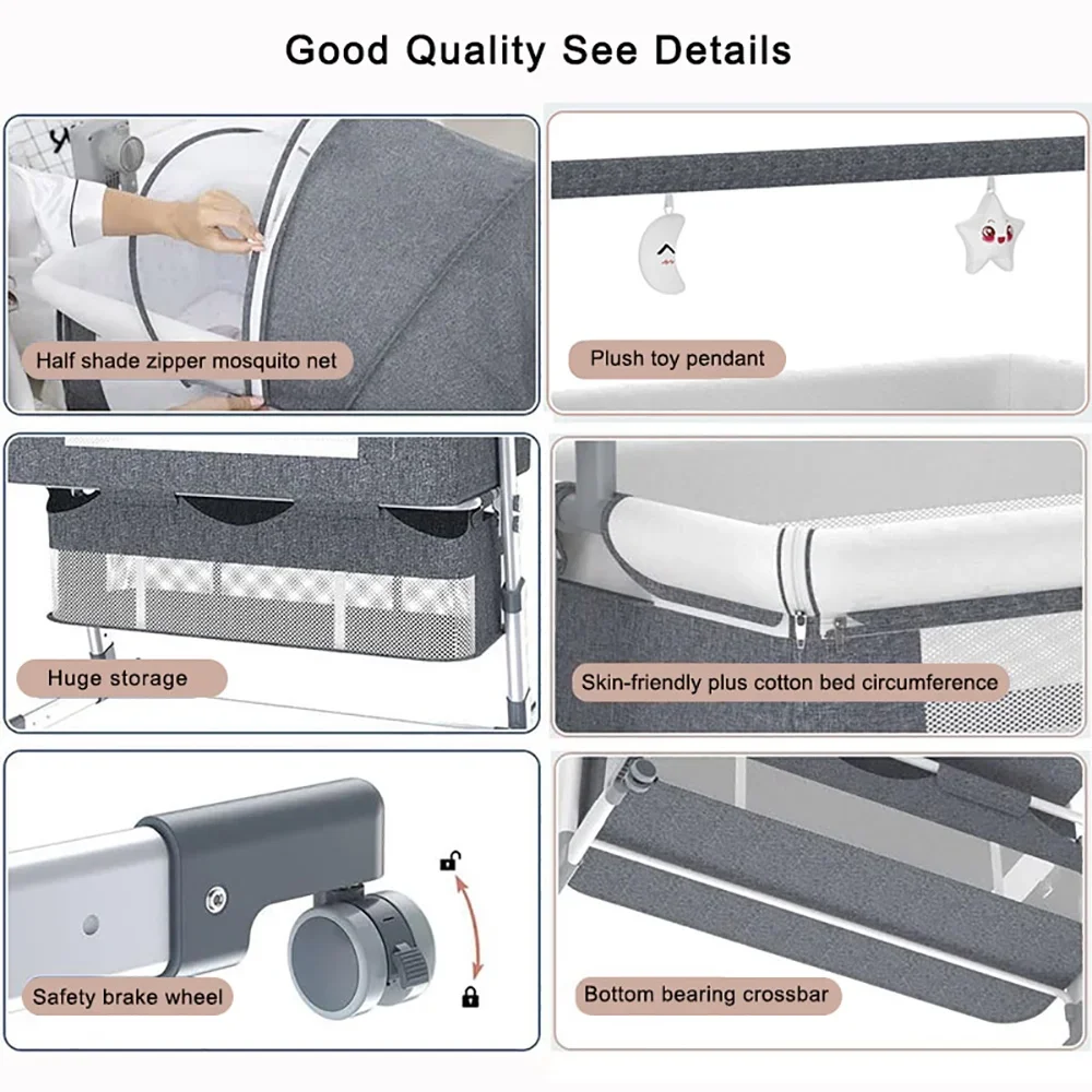 【Package Content】1x Frame + Bed ,1x Safety Cover,1x Bottom Basket With Frame, 1x Bed Mat, 1x Mosquito Net,1x Remote,1x Charging Cable, 1x Packing Bag