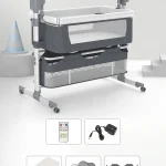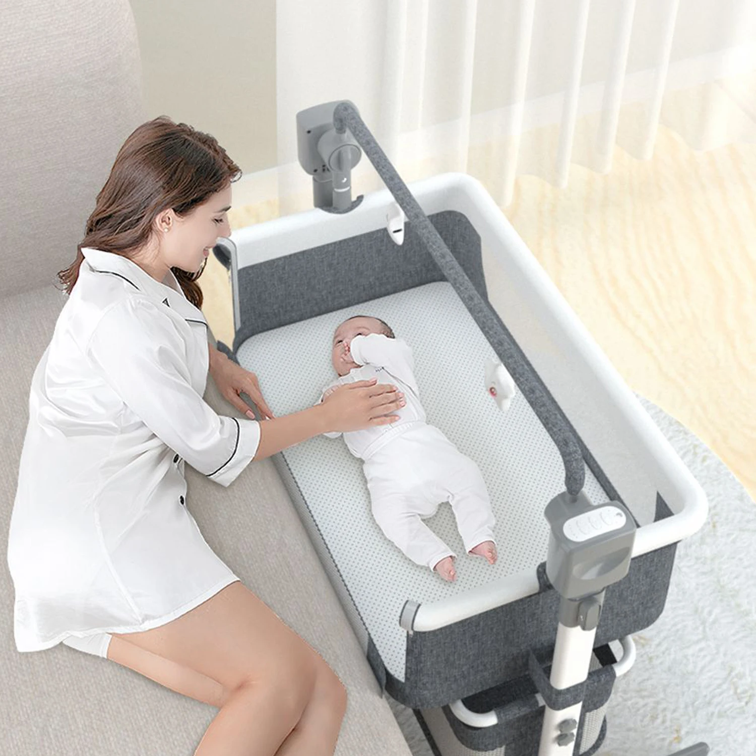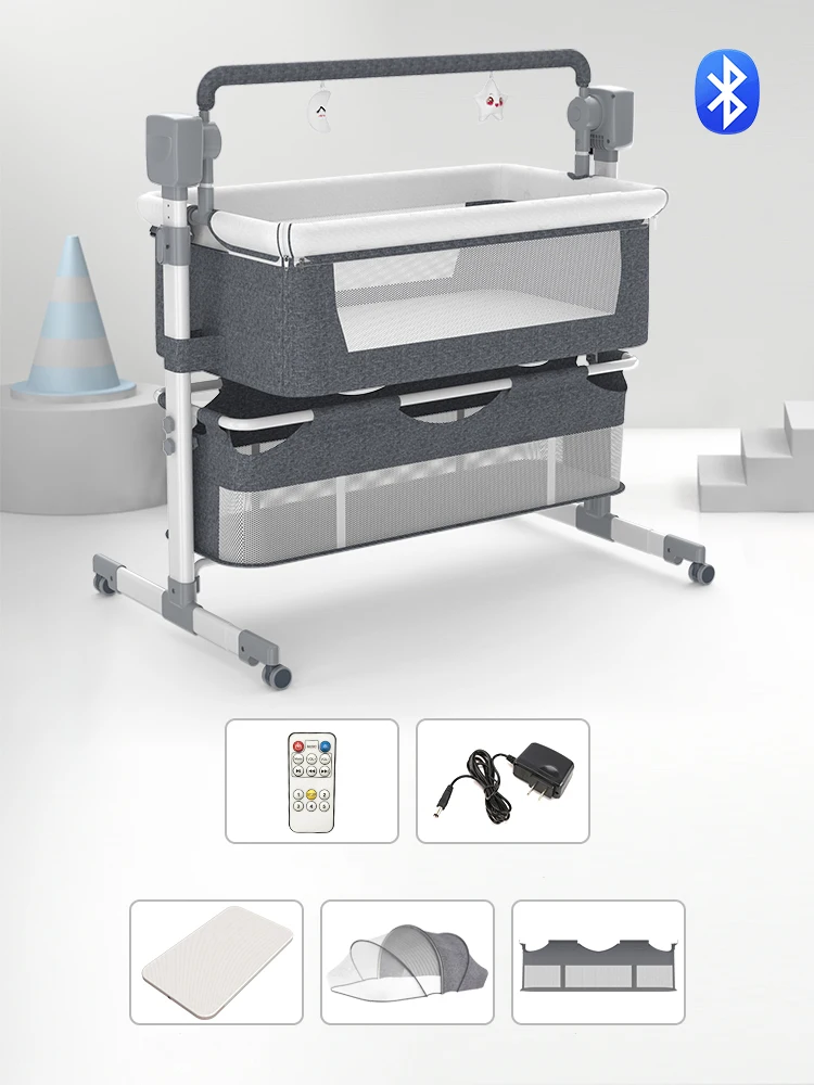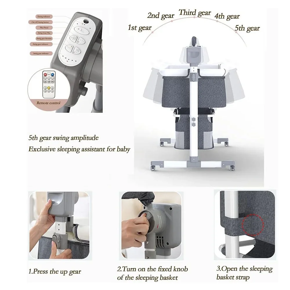 【Electric Rocking Bassinet】:The duo controls on cribs are remote control and panel control. There is 5 different swing strength of the crib. And there is 3 gear timing(8 mins, 15 mins, and 30 mins), auto-stopwhile timing ends. It also has Bluetooth musical accompaniment.